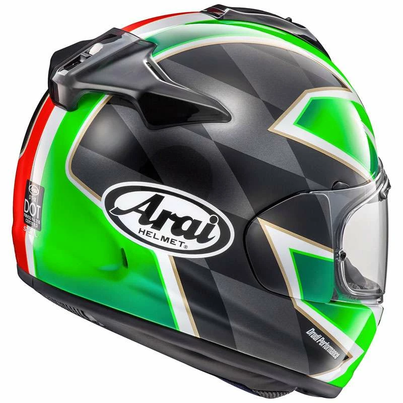 l Chaser-X è il terzo casco Arai che utilizza la nuova tecnologia VAS (Sistema ad asse variabile) che offre un’area sulla calotta molto più larga e liscia sopra la linea di test SNELL migliorando notevolmente l’importante proprietà di rimbalzo del casco. Il Chaser-X inoltre utilizza un sistema di ventilazione completamente nuovo derivato dal modello RX-7V, immediatamente riconoscibile dalla grande presa d’aria singola sulla parte superiore del casco. Questo ottimo sistema di aerazione deriva dal sistema diffuser dell’RX-7V. L’interno sostituibile è rivestito in tessuto antimicrobico. Il Chaser-X è dotato di FCS (Sistema di contorno facciale) e di un mini sottomento fisso e non retrattile. Anche la presa d’aria sulla mentoniera è una novità, mentre il sistema di blocco visiera sviluppato per la Formula Uno è lo stesso utilizzato per l’RX-7V. Tutti i caschi Chaser-X sono dotati di visiera Max Vision standard con lente Pinlock inserita separatamente nella confezione.