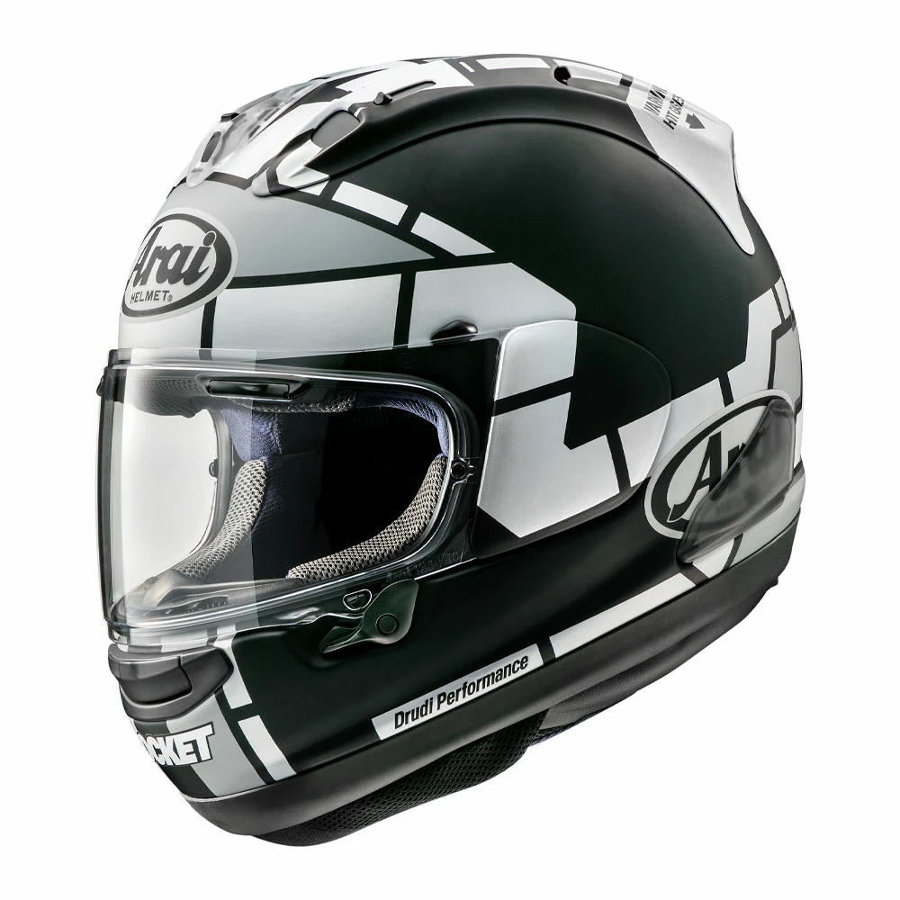 L’RX-7V rappresenta il massimo della conoscenza e della tecnologia di Arai odierna. Una delle modifiche che balzano subito all’occhio è il posizionamento del sistema di ancoraggio della visiera, che, grazie al sistema VAS (Variable Axis Sistem -la visiera non fa perno su un punto fisso, ma per muoversi segue un percorso obbligato, in questa immagine potete vederne il meccanismo-), ora trova posto 24 mm più in basso rispetto al modello precedente. Ciò si traduce in una maggior superficie liscia di calotta intorno alle tempie del pilota, in modo da assicurare un maggior assorbimento degli urti. La calotta esterna è realizzata mediante l’utilizzo di fibre più resistenti e di una nuova resina che le dona maggior rigidità; nonostante ciò, il suo peso si è ridotto di 30 grammi circa. Grazie alla nuova calotta ora c’è più spazio tra la bocca del pilota e la mentoniera (+ 3 mm). Nuovo anche il sistema di bloccaggio della visiera, che deriva dai caschi utilizzati in Formula 1; una speciale leva permette di sbloccare ed aprire la visiera di uno scatto, o completamente, con l’utilizzo di un solo dito. Per aumentare la stabilità alle alte velocità, i convogliatori d’aria superiori sono ora più lunghi di 20 mm e, grazie anche alle nuove prese d’aria, cresce il volume d’aria che riesce ad entrare all’interno del casco (+ 11%), per una maggior ventilazione nella giornate più calde. Il rivestimento interno, completamente removibile, è realizzato con il nuovo materiale “Eco-pure”, più morbido rispetto al precedente, antibatterico e anallergico. I nuovi interni dispongono di spessori regolabili, in modo da permettere a qualsiasi pilota di trovare la calzata ideale. Inoltre Arai RX-7V gode della doppia omologazione, ECE 22-05 e Snell.