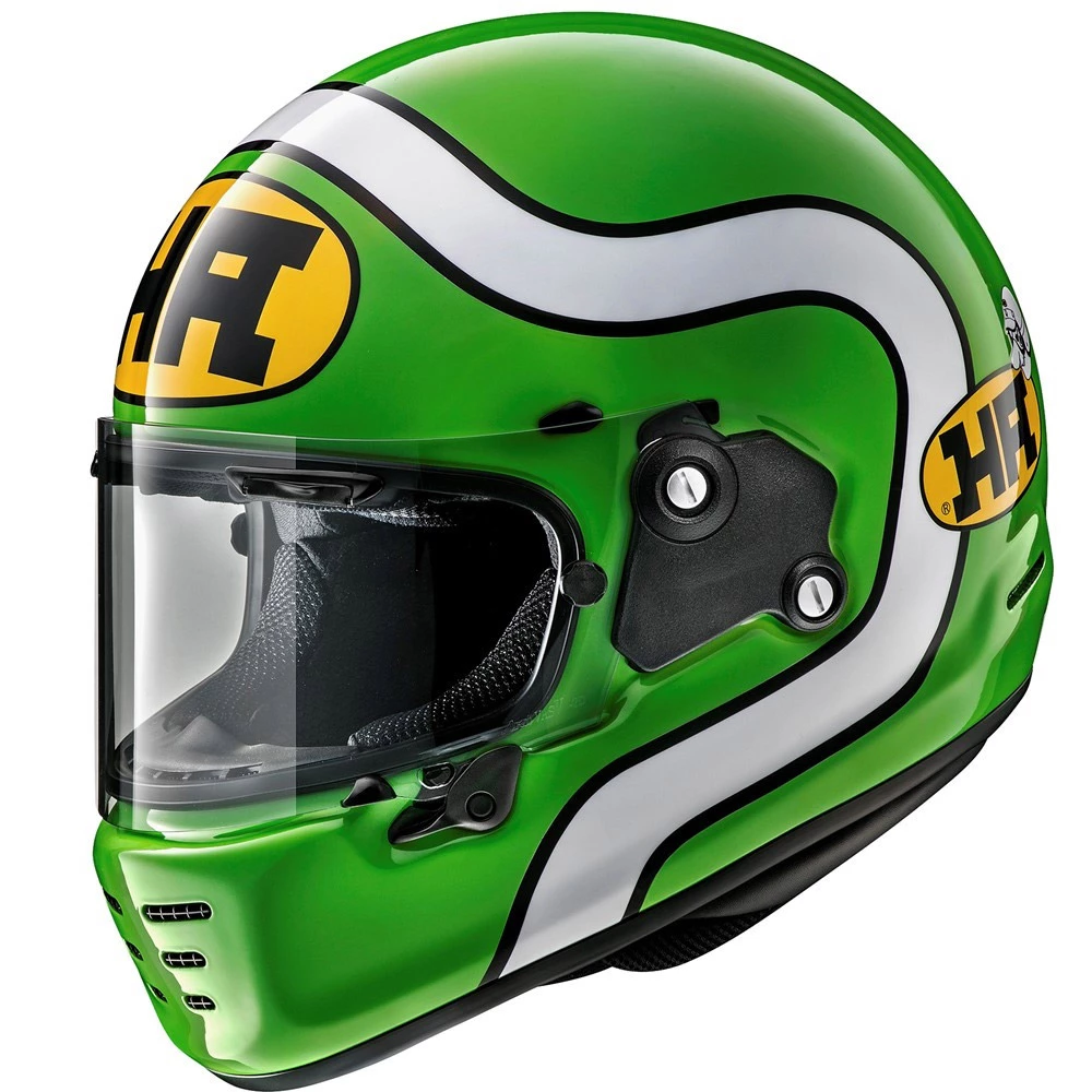 Gli anni, del resto, in cui è nata la leggenda di Arai, con piloti come Wes Cooley e Freddie Spencer. Non sono grafiche replica quelle che impreziosiscono il nuovo Arai Concept-X, ma è inevitabile riconoscere nei motivi sul nuovo casco della Casa di Ohmiya quelli che piloti e appassionati di quegli anni sfoggiavano in quel periodo se non siete proprio di primo pelo, quei motivi gialli, rossi e verdi evocheranno immediatamente l’immagine di qualche moto, probabilmente giapponese, dalla vostra memoria. Bisogna invece essere dei profondi conoscitori della storia Arai per capire il significato del logo “HA” che campeggia sul frontale.