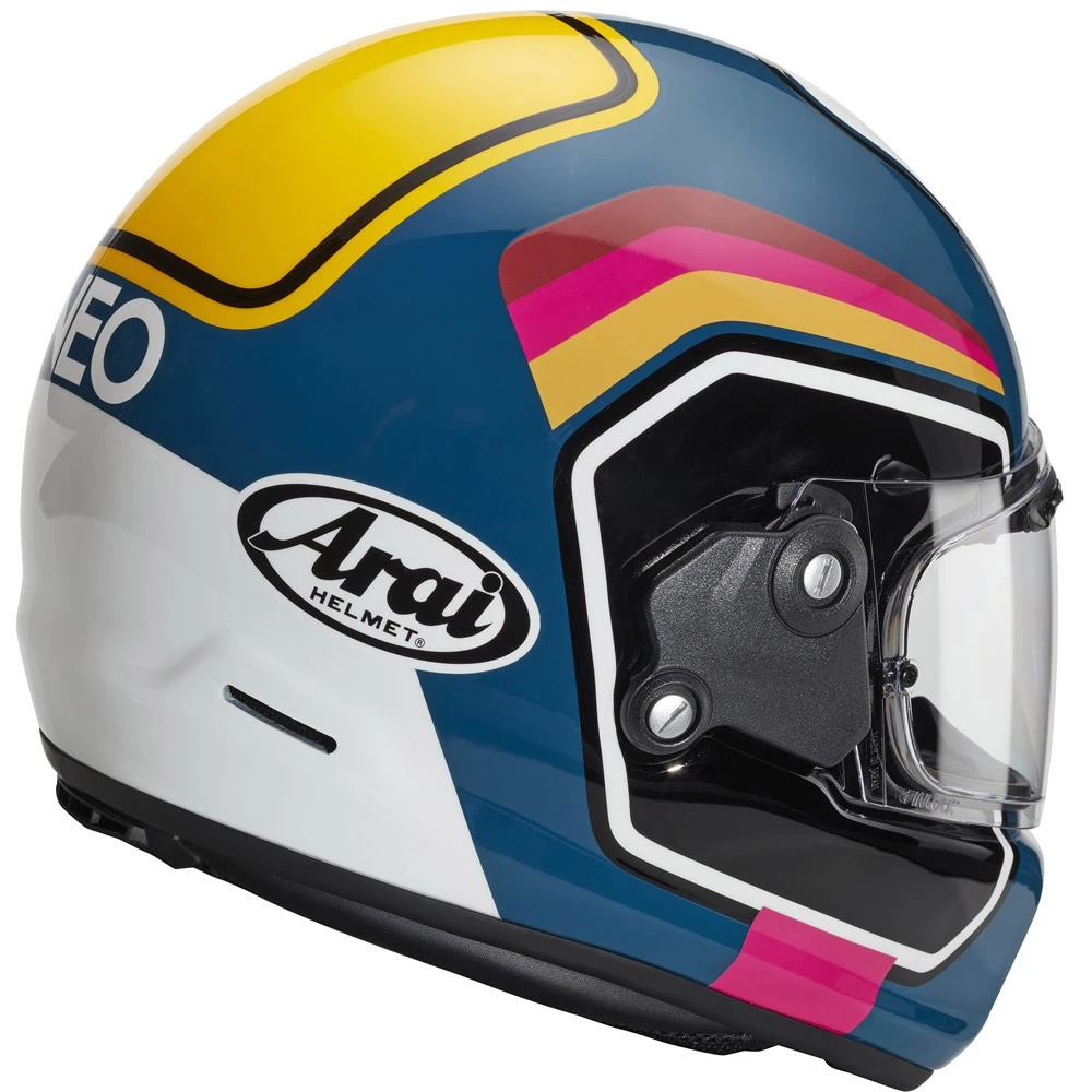 Gli anni, del resto, in cui è nata la leggenda di Arai, con piloti come Wes Cooley e Freddie Spencer. Non sono grafiche replica quelle che impreziosiscono il nuovo Arai Concept-X, ma è inevitabile riconoscere nei motivi sul nuovo casco della Casa di Ohmiya quelli che piloti e appassionati di quegli anni sfoggiavano in quel periodo se non siete proprio di primo pelo, quei motivi gialli, rossi e verdi evocheranno immediatamente l’immagine di qualche moto, probabilmente giapponese, dalla vostra memoria. Bisogna invece essere dei profondi conoscitori della storia Arai per capire il significato del logo “HA” che campeggia sul frontale.